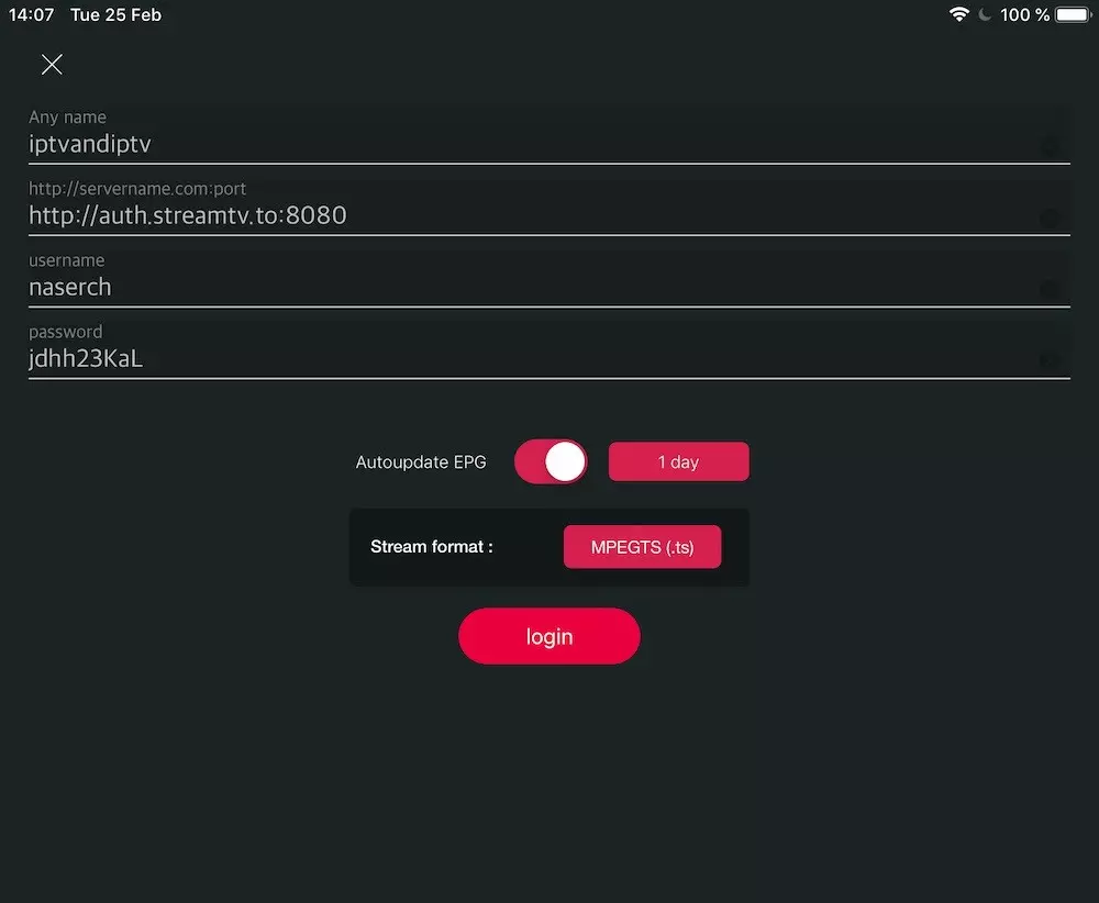 Enter Xtream based connection details: Server, username and password which provided by your IPTV provider. (the details in picture are example, and you need enter your own)